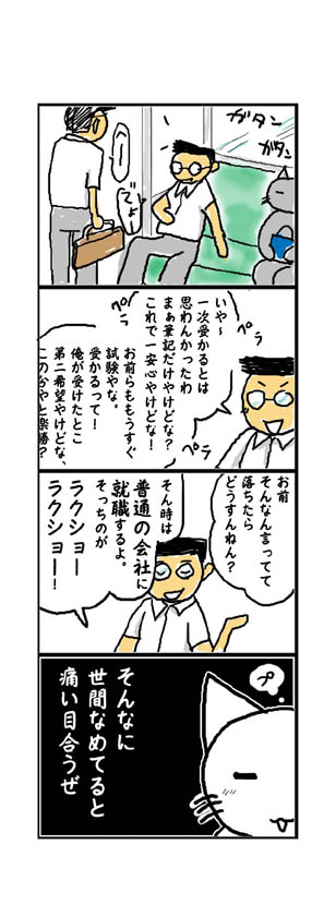 昨日出勤した人に「ラッキーガールめ!」と言われました。 何だ何だと聞いてみれば「昨日休みやがって~!」と(笑)。 かーなーり大変だったみたいです(*´ω`)ノ いや、ウチも休みたくは無かったんだが…休めって言われたんだよ?(*´ω`)ノ <昨日出勤した人お疲れ! 3年生はこれから大変な時期ですね。 これからの人生の岐路に立つわけです。 進学か、就職か… 彼は進学するみたいでしたが…。 そこにいたのは4人くらいの集団。 その中で彼が一番先に試験を受けたみたいです。 さらには一次通ったみたいですね。おめでとう! 浮かれてるね! でも他の皆は試験すらまだみたいだね。 一応フォローで「大丈夫やって!お前らも受かるって」と言っていたが… 君は試験を受ける前の、独特のプレッシャー…、あの気持ちを忘れたのかな? この時点でかなりビミョーな空気が流れてたよ~(´∀`) ちょっとした反撃か「それで落ちたらどうすんねん?」って。 「そん時は普通の会社に就職するわ。」就職の方が楽勝楽勝~♪ っはっはっはっは! そんなに甘くねーぞ?! 普通の会社ってなんやねーん! 学生には学生の苦労があるが、社会に出たらその比じゃねーぞ? まぁまだその苦しみはわからんだろうがな! と、ほくそえんでしもうたよ(笑) これからじっくりとわかるだろう。うん。嫌でもな! まぁ他にも色々言ってましたが。 「あの学校行きたいけど、家に金ないしな~」とか。 今、学校に行かして貰ってるだけでもありがたいと思いなさい(´・ω・`) 公務員になるのは大変やけど自衛隊なら余裕やな!とか。 空気の読めてない発言ばかりしてたなぁ(笑) 自分ひとりだけ座ってたしな。ずれたらもう一人座れたのにな。 でも、自分も昔は同じような事言ってたんやろうな~(´ー`)y─┛~~<遠い目 将来の事とか、考えてるようで考えが及ばずで、その場その場を凌ぐのに精一杯やったなぁ~。 あの時、違う道に進んでればどーなってたかな~とか。今でも思わんでもないが。 世の中の学生さん。学生でいられる時間は短いんだから、なるべく学生で居る時を謳歌してください。 社会人ですごす期間のほうが圧倒的に長いんだから。 とか言いながら、ウチは学生時代には戻りたくは無いが(笑) 今で丁度、学生でいた時間と働いている年数が同じになりましたが…多分まだまだ後数十年、社会人として生きていかなあかんのか~…(/--)/ やっぱりここは宝くじでドーンといっきに大金持ちになりたいところですな!(*´ω`)ノ 目指せ悠々自適生活!w これ書きながら「火垂るの墓」みてるが… 切ないですな!(つД`) 毎年毎年、なんとなく見てしまうが(他にろくな番組がない…) お兄ちゃんが健気で…(TωT) セツコちゃんがいるおかげで「お兄ちゃん」として頑張って来れたんだよな~… ウチの親が戦後直後生まれで、当然ウチは戦争の苦しみを知らんわけですが… なんか痛々しいわ~…(つД`) って感慨にふけりながら、今の飽食時代に感謝をしなきゃとは思うが、 この時代なりにしんどい事も多いさ!